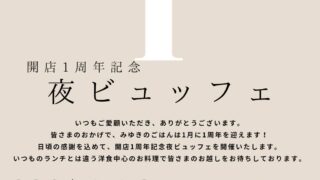 いつもご愛顧いただき、ありがとうございます。皆さまのおかげで、みゆきのごはんは2026年1月に1周年を迎えます!日頃の感謝を込めて、開店1周年記念夜ビュッフェを開催いたします。いつものランチとは違う洋食中心のお料理で皆さまのお越しをお待ちし...